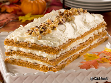 In a large bowl, combine eggs, 1 cup granulated sugar, the pumpkin, lemon juice, flour, baking powder, cinnamon, ginger, nutmeg, and salt; mix with an electric mixer until smooth. Pour onto prepared baking sheet. Sprinkle 1/2 cup walnuts over batter. Bake 12 to 15 minutes, or until a toothpick inserted in center comes out clean.