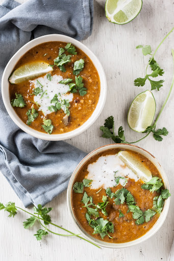 In a large stock pot heat the coconut oil over medium-high heat. Add the onion, ginger, serrano pepper, curry powder and cayenne pepper. Cook until the onions becomes slightly soft and the spices are fragrant. About 5 minutes. Stir in the eggplant, honey, tamari, tomatoes and chickpeas. Cook until fragrant. About 3-5 minutes. Add the coconut milk, veggie stock and plenty of salt and pepper. Bring the mixture to a boil. Reduce heat to medium-low and simmer for about 30-45 minutes. Add more veggie stock (or water) if too much liquid evaporates. Carefully, with an immersion blender roughly puree half to 3/4 of the soup. Leave it slightly chunky for texture. You can also do this by carefully transferring half of the soup to a blender. Process until smooth. Return the pureed soup to the pot with the remaining “chunky” soup and stir until well combined. Season soup with fresh lime juice, lime zest and plenty of minced cilantro. Adjust salt and pepper as needed and serve hot with a dollop of coconut cream.