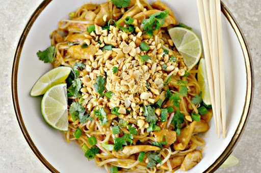 Serve immediately topping with the remaining dark green onion slices, torn cilantro, chopped peanuts and a squeeze of fresh lime.