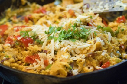 When the heat has decreased, pour egg mixture into skillet. Stir gently to cook with the peppers, folding mixture very gently as it cooks. Add in grated cheese and chopped cilantro, and stir to combine. Serve with mashed black beans and flour tortillas.