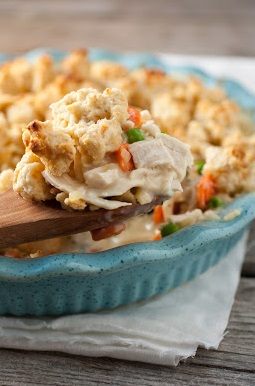 Heat olive oil over medium high heat. Once hot, add diced carrots, onion and celery. Saute vegetables, stirring occasionally until lightly golden and tender, about 5 - 6 minutes. Pour vegetables into a bowl and set aside. Reduce heat to medium, melt butter in saucepan (I like to brown it a bit for and extra layer of flavor), then add in flour and cook, stirring constantly for about 20 seconds (it will be very thick). While stirring, slowly add in milk followed by reserved chicken broth, lemon juice, parsley, thyme and season with salt and pepper to taste. Bring mixture just to a boil, then slightly reduce heat and allow to cook about 1 minute longer until thickened, stirring constantly. Remove sauce from heat and add sauteed vegetables, frozen peas and diced chicken to sauce, then toss to evenly coat. Pour mixture into a 9-inch pie dish and sprinkle with baked crumble topping (mine fit perfectly in my pie dish but if yours is coming close to the top edge you may want to sit it on top of a cookie sheet to prevent spills in your oven). Bake in 400 degree oven until nicely golden about 12 - 14 minutes. Serve warm.