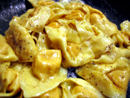 Meanwhile, in a 12 to 14-inch saute pan, melt the butter with the poppy seeds. Drain the cooked tortelloni carefully and gently place in pan. Add remaining scallions and toss to coat. Season with salt and pepper and serve immediately