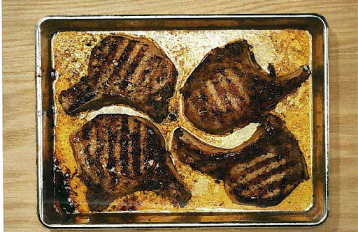 When the chops are cooked, remove from the broiler or grill and let them rest for 5 minutes before serving. Meanwhile, slice the cored apples into thick rounds, drizzle with olive oil, season lightly with salt and pepper and place on the broiler pan or grill until tender when pierced with a fork. These, too, should be brushed with the maple glaze and turned frequently.