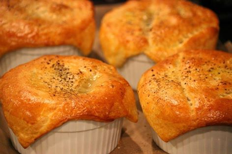 Remove dough from package. Roll out and pinch together perforations. Roll out slightly to measure 8 inches across. Cut four squares measuring 4 x 4 inches. Drape over filling, stretching slightly so dough hangs over the edge of the ramekin. Brush with egg wash and top with Sea Salt and freshly ground black pepper.