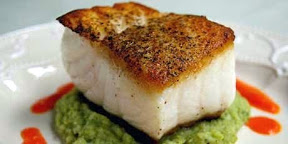 • Grilled Sea Bass with Roasted Red Pepper Sauce and Brocolli Puree