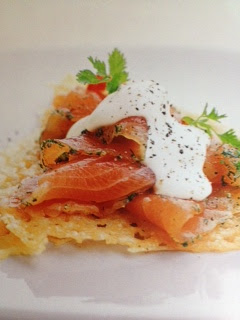 To make the Parmesan sheets, preheat the oven to 350F. Thinly sprinkle the Parmesan into 3 inch triangle shapes (to make at least one per serving) onto two baking sheets lined with baking paper. Bake for 10 minutes, or until crisp. Top with gravlax, sour cream, chevril, and black pepper.
