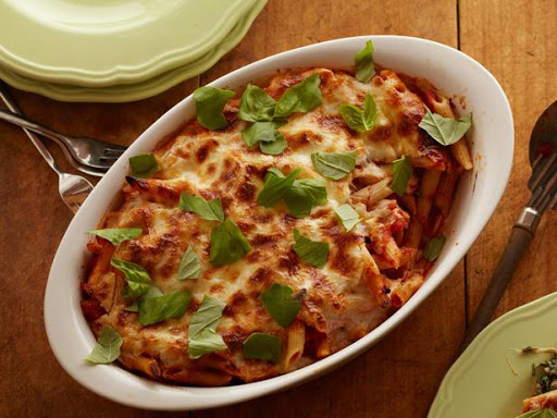 Bake until bubbly and golden brown on top, about 30 minutes. Let stand for 10 minutes, and then scatter the torn basil over the top.