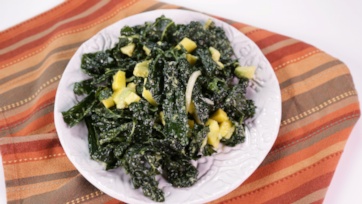 Meanwhile, add the Kale to a large mixing bowl, season with Salt and Pepper, and drizzle with Olive Oil. Massage the kale with your hands, making sure to coat the Kale with Oil and begin to break down the cells structure. Toss in the diced Mangos and Avocados.
