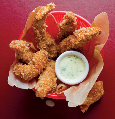 At Mitzi's in Winnipeg, Canada, these chicken fingers are served with crinkle-cut fries, coleslaw, and a honey-dill dipping sauce — they're so good that even grown-ups line up for them.