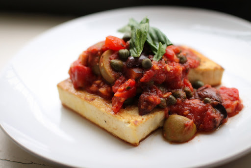At this point, either top your tofu with a half cup of the puttanesca orrrr toss it all with some pasta. Top with some basil and maybe some more capers and olives. Eat!