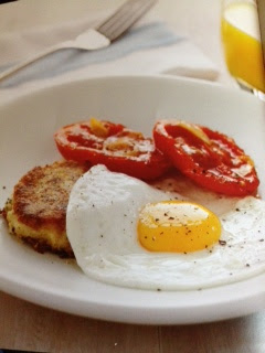 Fried Eggs and Tomatoes on Scallion Potato Cakes