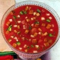 Gazpacho, a Spanish favorite, is a cold soup that's first cousin to a salad and even more refreshing. The base is rip, fresh tomatoes and tomato juice pureed with other salad vegetables--cucumber, pimiento, onion and green pepper--and piquantly flavored with olive oil, vinegar and a touch of Tabasco. Serve it icy cold. On the side, serve small bowls of vegetables used in the soup, chopped, along with crisp garlic croutons, for guests to add themselves.