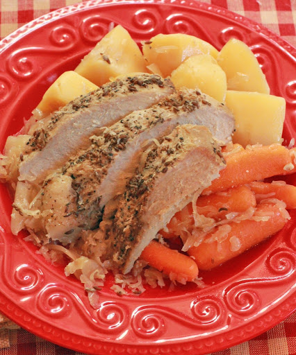 Rub the pork roast with oil. Rub in the caraway seeds, salt, and pepper. Set aside. In the bottom of a 6-quart crock pot, place the garlic, potatoes, carrots. Pour the wine or apple juice over the vegetables. Place the roast on top, top with the sauerkraut and its liquid.