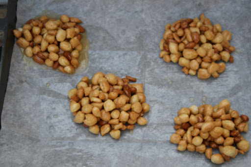 In a saucepan, heat honey and sugar together and boil very gently for 3 to 5 miutes until just amber col0red. Lower the heat and stir in nuts and dough puffs tossing them with syrup and taking care not to break them. Shut flame.