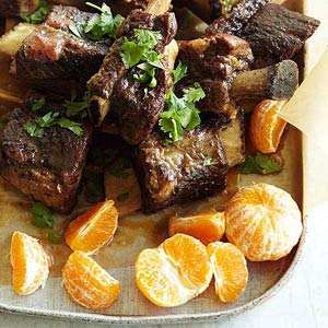 Using a slotted spoon or sieve, transfer ribs to platter; cover to keep warm. Strain cooking liquid; discard solids. Skim fat from cooking liquid. Sprinkle ribs with cilantro. Serve cooking liquid with ribs for dipping. Serve ribs with clementines.
