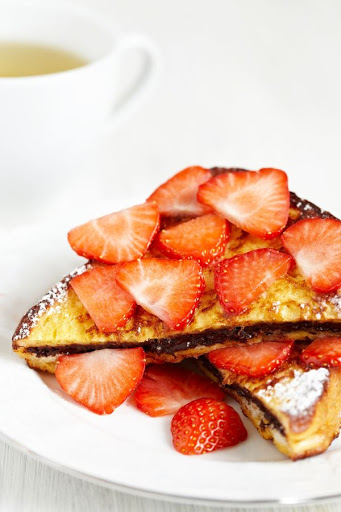2. Mix Nutella with strawberries that have been washed and quartered. Spread 2-3 tablespoons of Nutella and strawberries on two slices of bread. Place the remaining slices of bread on top to create two separate Nutella sandwiches. *You could also save strawberries and use them as garnish once the French toast is cooked.