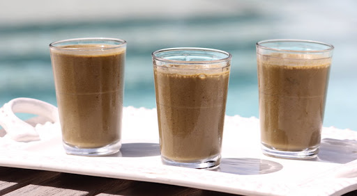 Place all ingredients, except for the ice, in a high-speed blender (such as a Vitamix) and process until smooth and creamy. Add the ice and process again until cold and creamy. Serve ice cold.