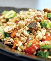 For the spelt, heat olive oil in pan over medium-high heat. Add garlic and let brown. Add spelt. Stir it around to toast a little and enhance its nutty flavour. Add half the vegetable stock and stir. Cook about 10 minutes and check back. (You want to cook spelt in stock, but you don�t want it to be soupy, so although I�ve suggested 6 cups (1.5 L), you might need less.) When first half of stock is absorbed, start adding a little more at a time, until spelt is moist and chewy. Don�t worry if there is still a bit of stock in the pot.