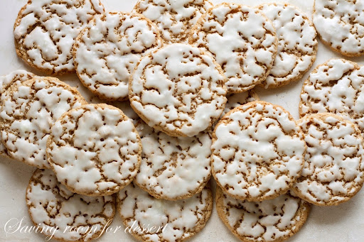 Combine the confectioners’ sugar with the milk or cream and water. Whisk until the sugar is dissolved and the icing is somewhat thick. Place the icing in a shallow dish or container, about 4×4 inches. Quickly dip the tops of the cooled cookies into the icing and let the excess drip off. Set the dipped cookie on the rack until the icing has set.