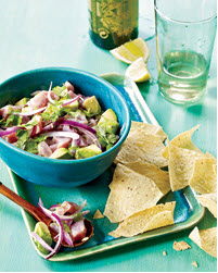 Just before serving, gently fold in the diced avocado and chopped cilantro and season with salt. Transfer the ceviche to a bowl or individual glasses. Garnish with cilantro leaves and serve with tortilla chips.