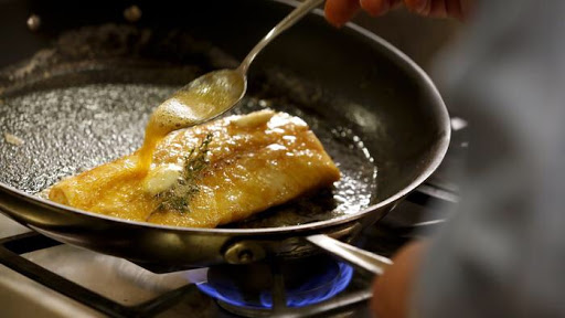 4.Carefully flip the fillet, using 2 fish spatulas if needed. Cook 3 to 4 minutes more. As the fish cooks, gently baste it with the fat in the pan, spooning over the oil and butter to keep the fish moist as it cooks.