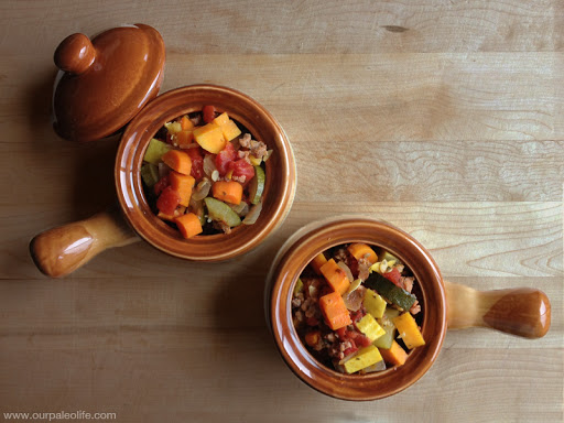 Add the prepared sweet potatoes, carrots, celery, zucchini, shallots, and garlic to the crock pot.