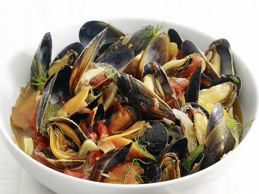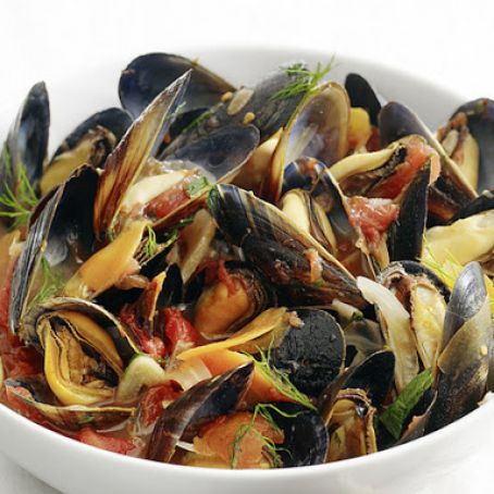- 2 pounds mussels (preferably cultivated), scrubbed well and beards pulled off
