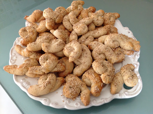 Roll a tablespoon of dough into a six inch log. Then coil the log around your finger. Gently lay it on a parchment covered baking sheet. Brush the tops of the coils with the egg white and sprinkle with sesame seeds. Bake at 350 degrees for 20 minutes. Do not brown.