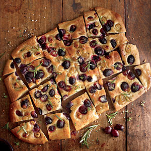 Don't be intimidated by homemade bread; even a beginner can master this simple baking sheet focaccia. It's an effortlessly gorgeous dish for entertaining, and the unexpected combination of sweet and savory flavors will impress. As an appetizer, serve the warm slab of bread, sliced, on a large cutting board with a few wedges of your favorite cheese. Try muscadines or figs in place of the grapes. For leftovers, spread the focaccia with peanut butter for a fresh, sophisticated spin on PB&J.
