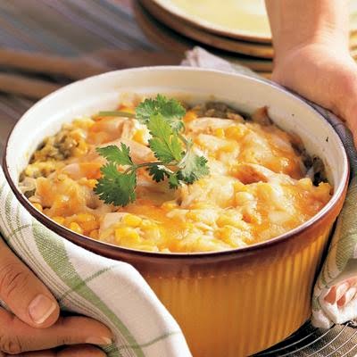 2. In deep 2 1/2-quart ceramic or glass baking dish, spread half of chips, overlapping slightly. Top with half of sauce, chicken, corn, and Monterey Jack. Repeat layers.