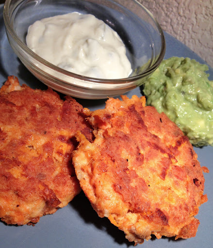 Heat oil in a medium skillet over medium-low heat (I set my flame to 4). Scoop mixture into 3 inch patties, about ½ inch thick. In batches (whatever fits in your skillet), cook patties about 3-5 minutes on each side, until lightly browned. Watch carefully to make sure they don't burn. My first batch was a little crispy.