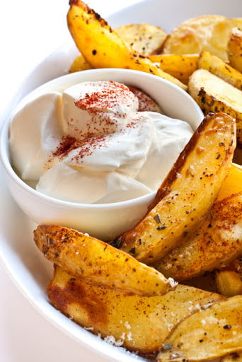 Put potatoes in a large Ziploc bag and pour in olive oil, rosemary, garlic, paprika, sea salt and pepper. Shake well to coat each wedge.