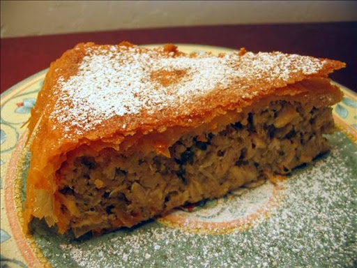 Layer 5 more sheets of phyllo in the same way, brushing each one generously with butter.