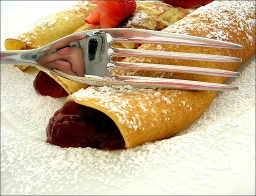 Turn the crepe by using 2 spatulas; or grasp the edges nearest you in your fingers and sweep it up toward you and over again into the pan in a reverse circle; or toss it over by a flip of the pan.