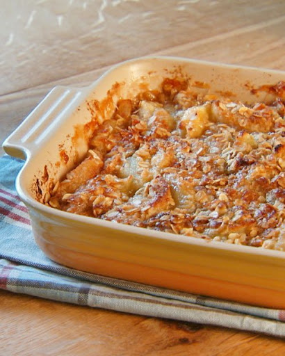 4). Make the topping in the same bowl. Combine the oats, brown sugar, nuts, flour, salt, and optional spices. Cut in the butter using a pastry blender, a fork, or two knives. Sprinkle the topping evenly over the fruit and bake on the center rack for 40 to 45 minutes, until the topping is dark golden and the apples are bubbling. Cool slightly on a wire cooling rack. Scoop out with a large spoon to serve in bowls.