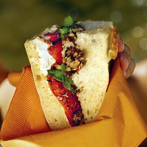 2. Spread cut side of top half of bread evenly with tapenade and cut side of bottom half evenly with goat cheese. Layer red pepper mixture and arugula over goat cheese. Place top half of bread, tapenade side down, onto red pepper and arugula layers.