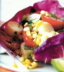 Place the corn,tomatoes, parlsey and hearts of palm in a larage bowl. Drizzle with some olive oil, season with salt and pepper, and toss together. Scoop the salad into the radiccio cups and serve with lime wedges.