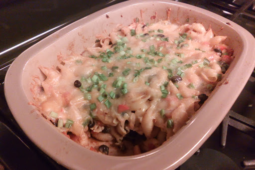Bake 20-25 minutes or until pasta mixture is heated through and cheese is melted. Sprinkle with remaining green onions.