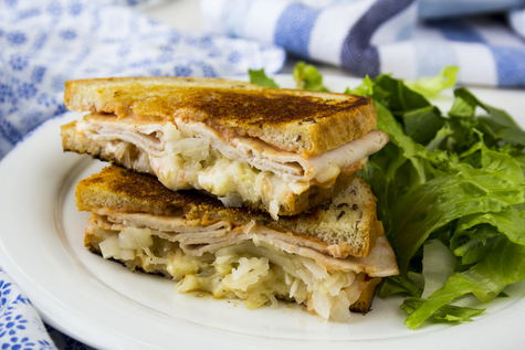 4. Top two slices with turkey, then sauerkraut, then cheese. Top with remaining bread slices, buttered side up.