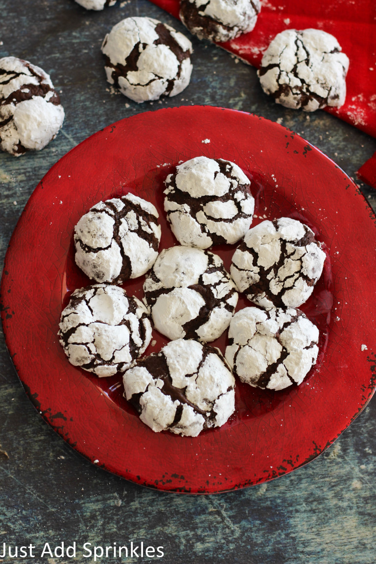 Line a baking sheet with parchment paper or spray with cooking spray. Add confectioner’s sugar to a small plate or shallow bowl. Scoop cookie dough into small balls and roll in powdered sugar until completely covered. The repeat once more, roll the cookie dough balls again in powdered sugar to get a good thick coating of powdered sugar.