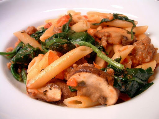 I had some Italian sausage that I needed to cook, and so I began to rummage through my refrigerator. I found fresh spinach, cremini mushrooms and a red pepper that needed to be cooked-- or it would go to waste. Before I knew it, I made a pasta dish that was slammin' good! I've never seen my husband dig in to a pasta dish, like he did this one. Did I mention it took about 45 minutes from start to finish?