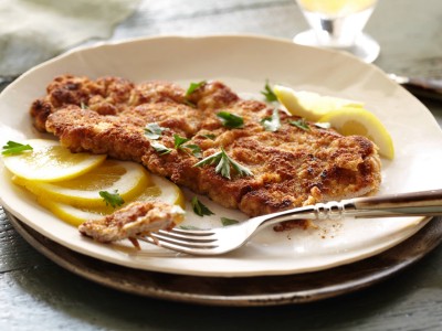 To serve, top the wiener schnitzel with the parsley and lemon wedges.