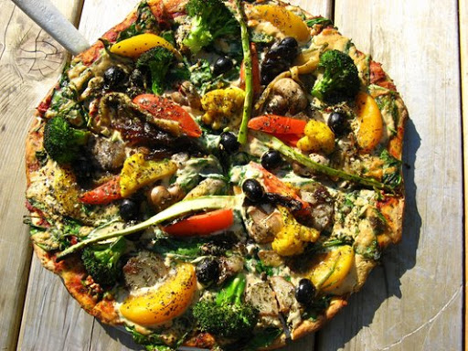 After sauce is creamy and thick in pot, add tapioca flour and stir for another 2 minutes, until glossy. Pour over pizza and bake.
