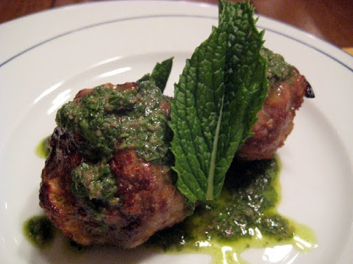 In the work bowl of a food processor, puree 1/2 cup oil, anchovies, capers, parsley, mint and white vinegar. Season sauce with salt if needed. Serve meatballs with the sauce.