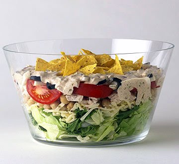 in a large bowl layer : lettuce, cheese, black beans , garbonzo, chicken, dressing olives, tomato, red onion, chips optional