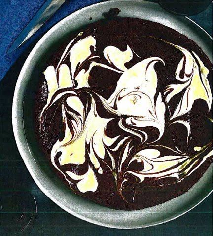 Combine and bake: Spread about half of the chocolate batter on the bottom of the pan. Alternately add large scoopfuls of the vanilla batter and the remaining chocolate batter to the cake pan. Use a knife, gently swirl the two batters together so they're mixed but not completely blended. Rap the pan against the countertop several times to settle the batters.