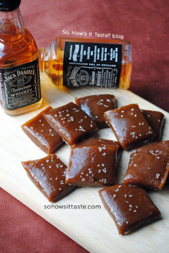 Om nom nom! I was pretty happy with these,although I wish I had taken them off the heat about 1 second earlier. They’re a teeny tiny tad bit darker than what I’d like,although they look as dark as the ones on Betty Crocker,and the ones I’ve done before. You really have to watch the sugar once it starts to change color,it goes fast! There’s a slight difference in taste between these and the ones without whiskey. I’m not sure if it’s a slight taste of burnt sugar from taking it off a bit late or if it’s the whiskey. I can see how the honey-flavored whiskey might blend in better,but I happen to like the taste of whiskey,so I didn’t mind. I really don’t think you’d be able to tell there’s whiskey in the caramels unless someone told you. They’re still decadently rich and creamy,with a hint of saltiness to balance. I’d make these again in a heartbeat!