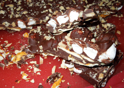 Sprinkle with chopped almonds and place the pan into the refrigerator to allow the chocolate to set up