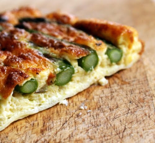 2) Line 8in x 8in baking tin with baking parchment. Pour in the egg mix, then lay the asparagus spears in the tin. Bake for 20 min until firm and golden. Can be eaten warm or cold.