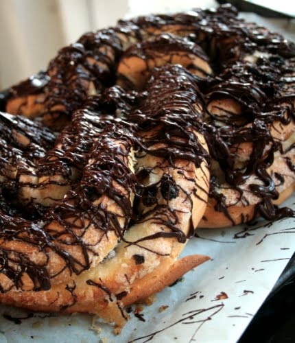 In the meantime, prepare the chocolate topping by melting the chocolate and butter in a bowl over boiling water. Once out of the oven, let the bread cool down a bit, place on a serving plate and drizzle with chocolate sauce.